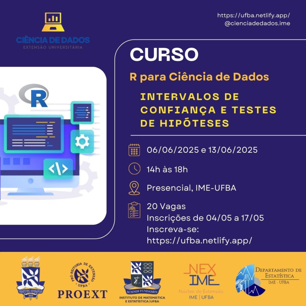 Sobre o curso: O objetivo deste curso é compartilhar o conhecimento de análise estatística de dados usando a linguagem R numa interação dialógica da comunidade acadêmica com a sociedade por meio da troca de conhecimentos. A ação cumprirá o papel de aproximar a academia da comunidade, popularizando a Ciência Estatística e trazendo para dentro da universidade a experiência e a grande demanda que profissionais têm de usar Estatística e Ciência de Dados. O curso se propõe a apresentar a linguagem R e os conceitos de intervalos de confiança e testes de hipóteses, métodos estatísticos amplamente usados, utilizando o pacote statBasics. O curso é gratuito e acontecerá no Instituto de Matemática e Estatística da UFBA nos dias 06/06/2025 e 13/06/2025 das 14h00 às 18h00.